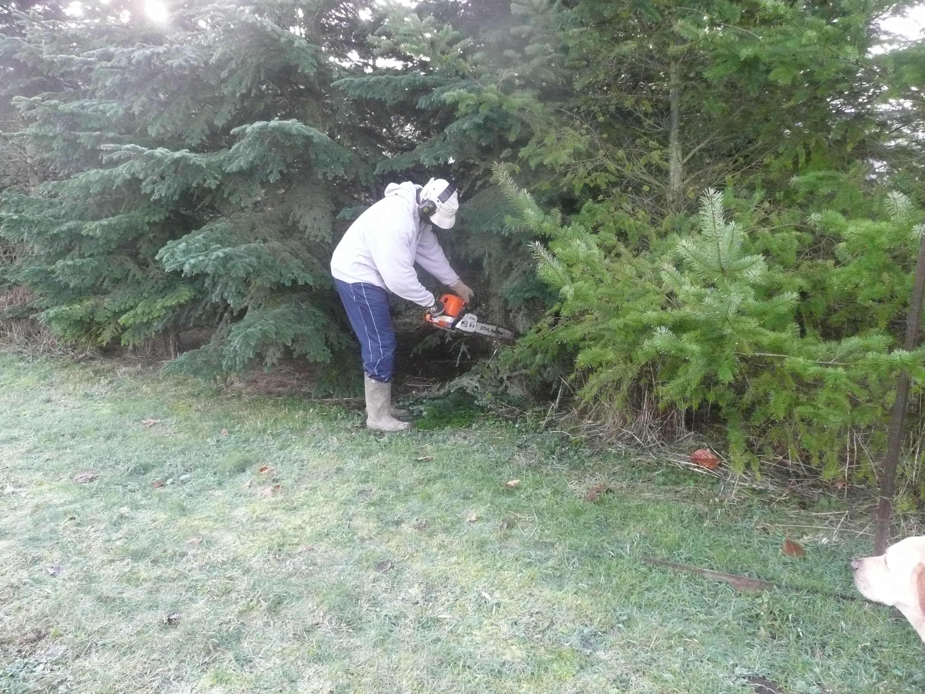 This years tree hunt took us into the trenches of our back yard. We have a row of trees in the back that I love having for privacy but they are planted a little close now that they are quite a bit bigger and need to be thinned out. Even before we bought the house Greg saw these trees as future Christmas trees. So, on a frozen morning we bundled up and headed out.