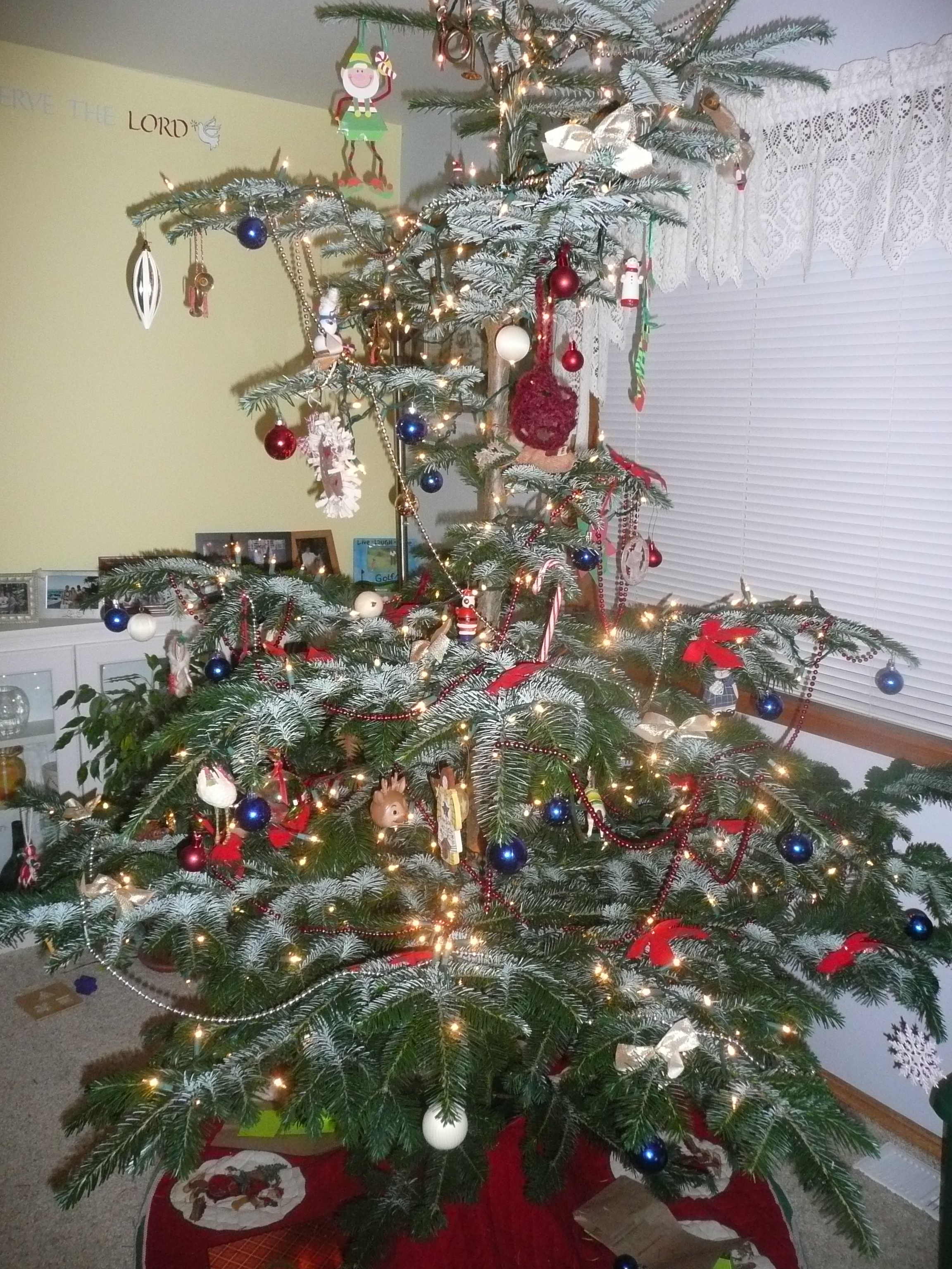 Here she is all decorated. A slight Charlie Brown resemblance. I asked Greg if we could glue in a few extra branches but being the practical one that he is he assured me they would die. Honestly I did not like the tree at first but it is growing on me.