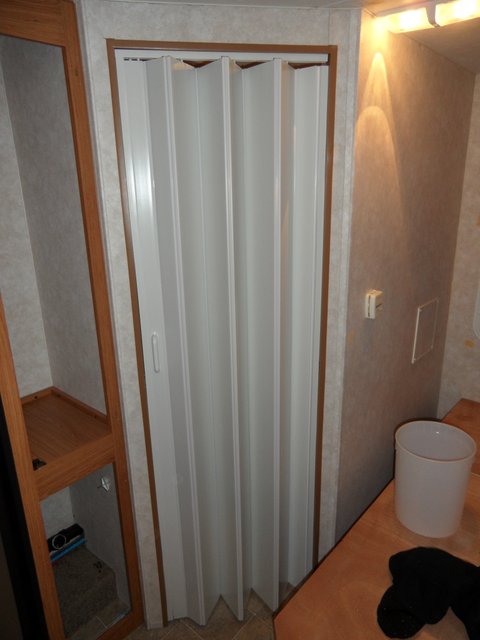So what we did to make the space more people (especially pregrant people) friendly is to install a accordian door. So far it has been a welcome addition to the trailer. It was lighter than the old door and way easier to go into and out of.