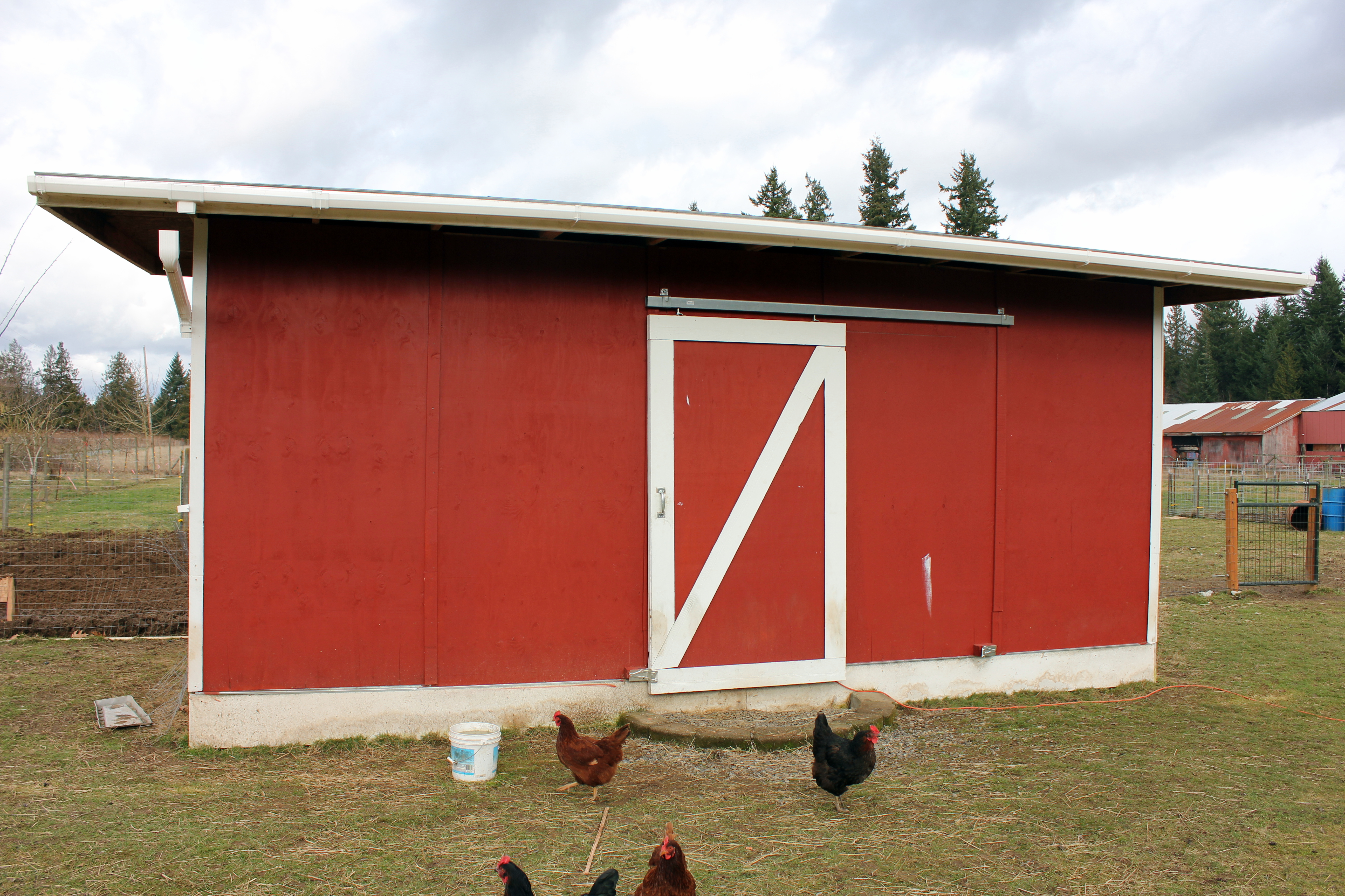 Hey! Did I ever mention I got a barn! A red one. I love, love, love it. It has two stalls on the pasture side and storage on the other for hay and grain. It has already needed repairs as Shawn was using it for target practice but she held her own pretty well. It will be so great to be able to keep chicks in there when we need to freshen our flock.